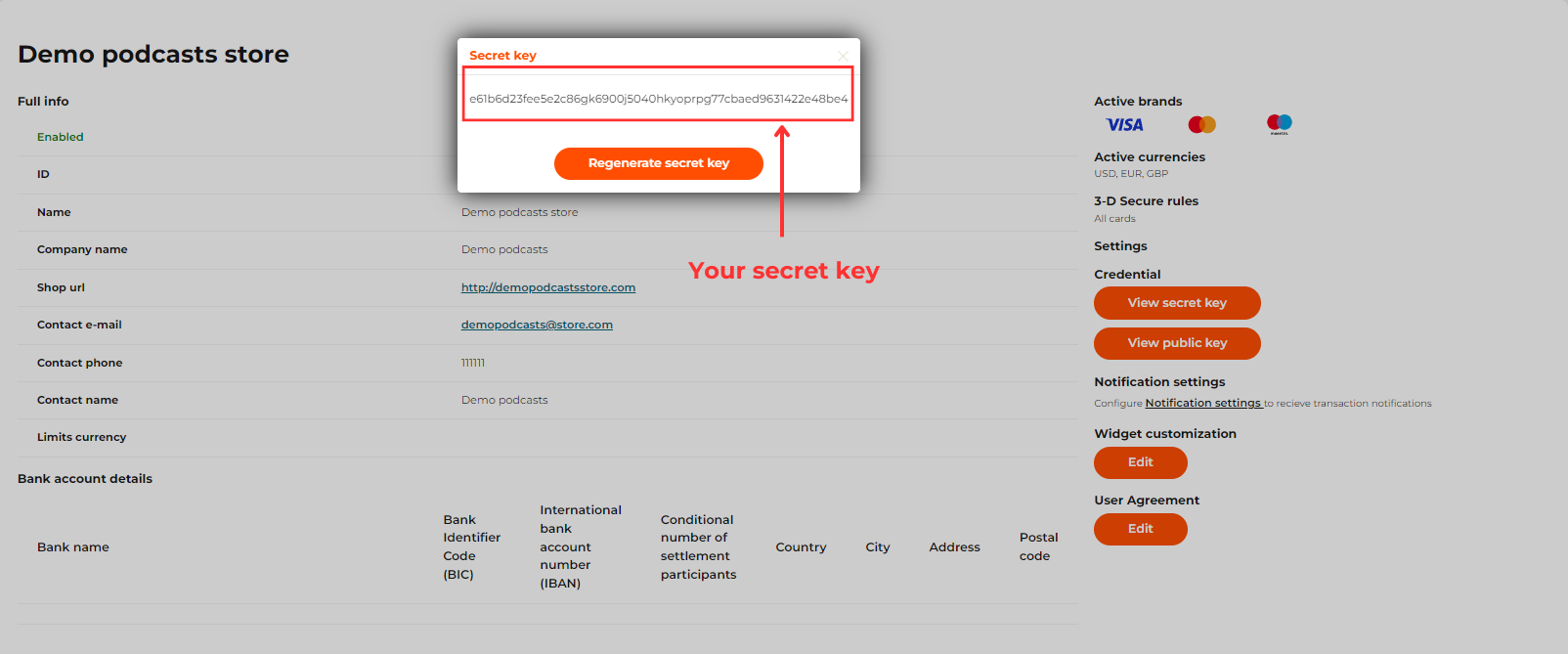 - Secret Key - will be shown when you click the View secret key button in the Credential section.